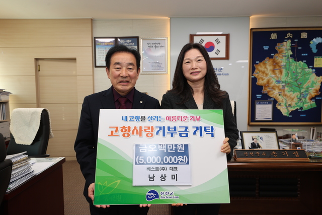 [동양일보 김지유 기자]남상미 베스트㈜ 대표는 7일 진천군청을 방문해 500만원을 고향사랑기부금으로 전달했다.